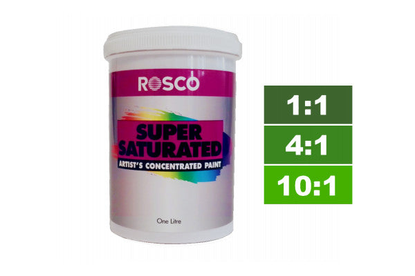 Rosco Supersaturated Paints should be diluted at least 1:1, with water, Rosco Clear Acrylic Glazes, or a combination of the two as necessary. Therefore, one litre of paint becomes at least two.