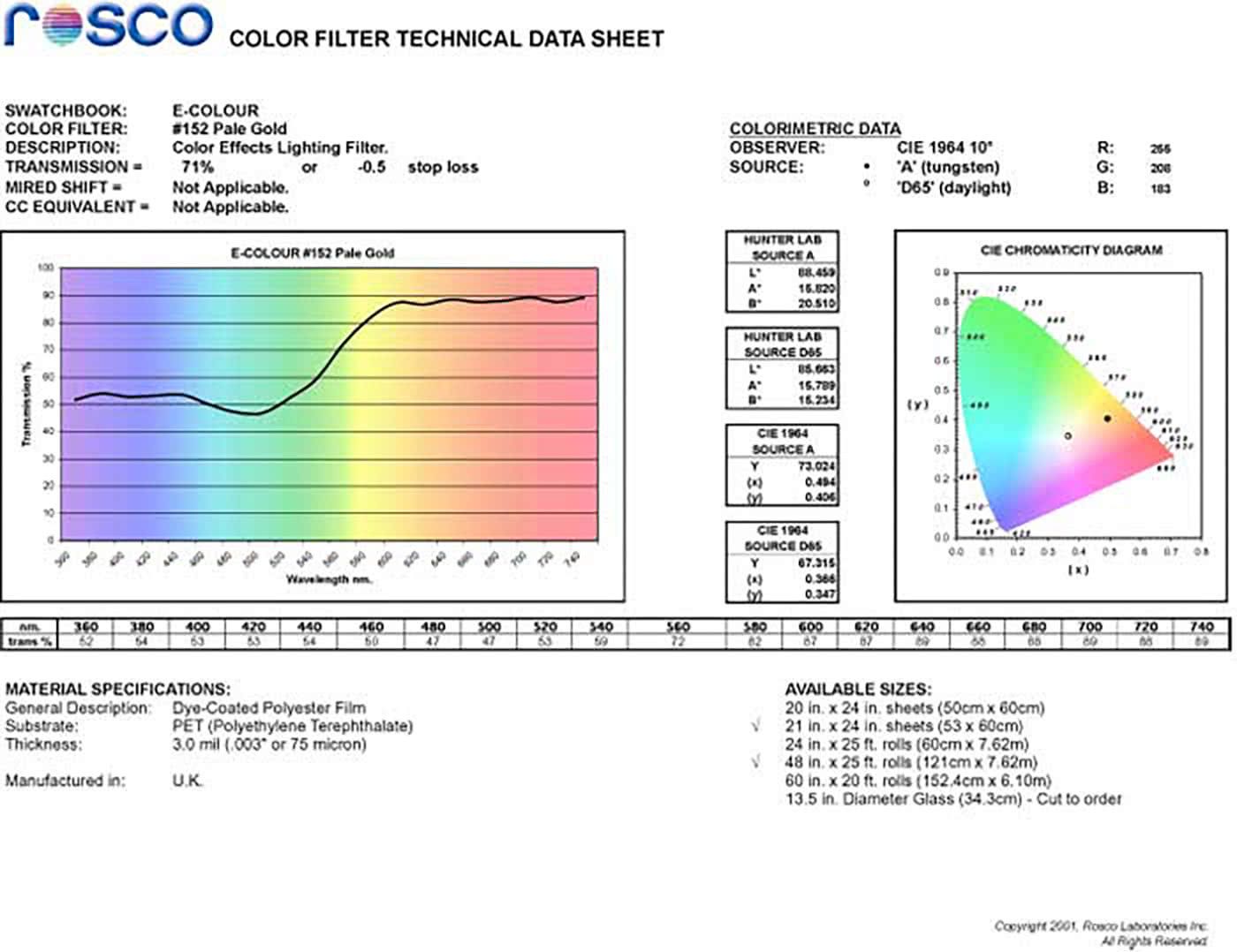 The Rosco swatchbook provides detailed information on the spectral energy curve of each filter. The curve describes the wavelengths of color transmitted through each filter. For example, Supergel 342 transmits approximately 40% of the violet and blue energy of the spectrum and 75% of the orange and red energy. It absorbs all energy in the yellow and green range.