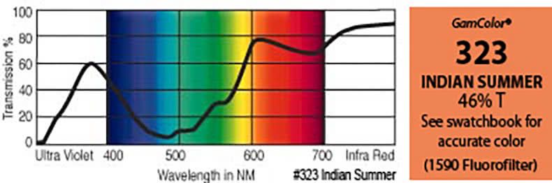 The Rosco swatchbook provides detailed information on the spectral energy curve of each filter. The curve describes the wavelengths of color transmitted through each filter. For example, Supergel 342 transmits approximately 40% of the violet and blue energy of the spectrum and 75% of the orange and red energy. It absorbs all energy in the yellow and green range.