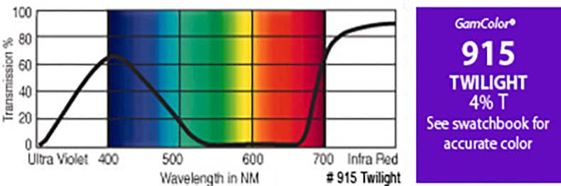 The life of color filters depends on many variables: the color, the instrument and lamp used, the dimmer level a filter generally runs at, and the amount of time the light is running. For these reasons it is impossible to assign a "life" for each filter. However some basics knowledge and experience can help with estimates. Dark green and dark blue filters usually burn out the fastest because they absorb the most infrared energy. Absorbing the extra infrared energy causes the plastic to reach it's melting temperature faster. When darker filters are needed try choosing filters that transmit high amounts of the 700 nm range. You can find this information by looking at the Spectral Energy Distribution (S.E.D.) curve located in the swatchbook for each Supergel color filter. Filters than transmit high levels at 700 nm may also transmit high levels in the infrared range above 700 nm.(See the Supergel swatchbook for information on how to read S.E.D. curves.)