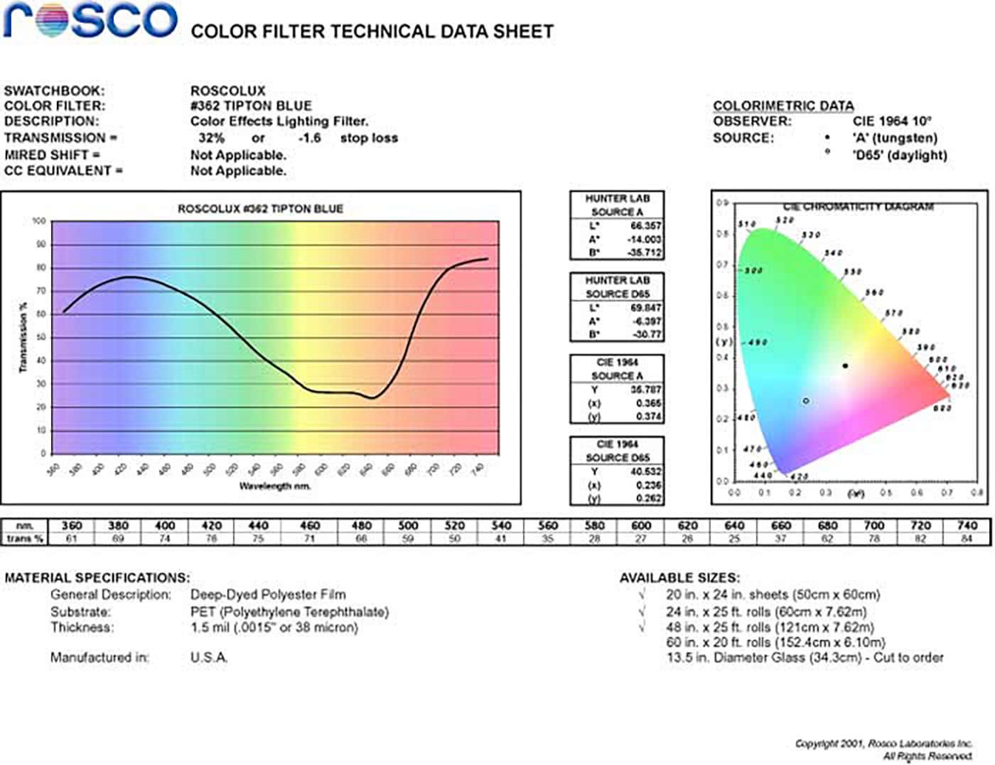 The Rosco swatchbook provides detailed information on the spectral energy curve of each filter. The curve describes the wavelengths of color transmitted through each filter. For example, Supergel 342 transmits approximately 40% of the violet and blue energy of the spectrum and 75% of the orange and red energy. It absorbs all energy in the yellow and green range.