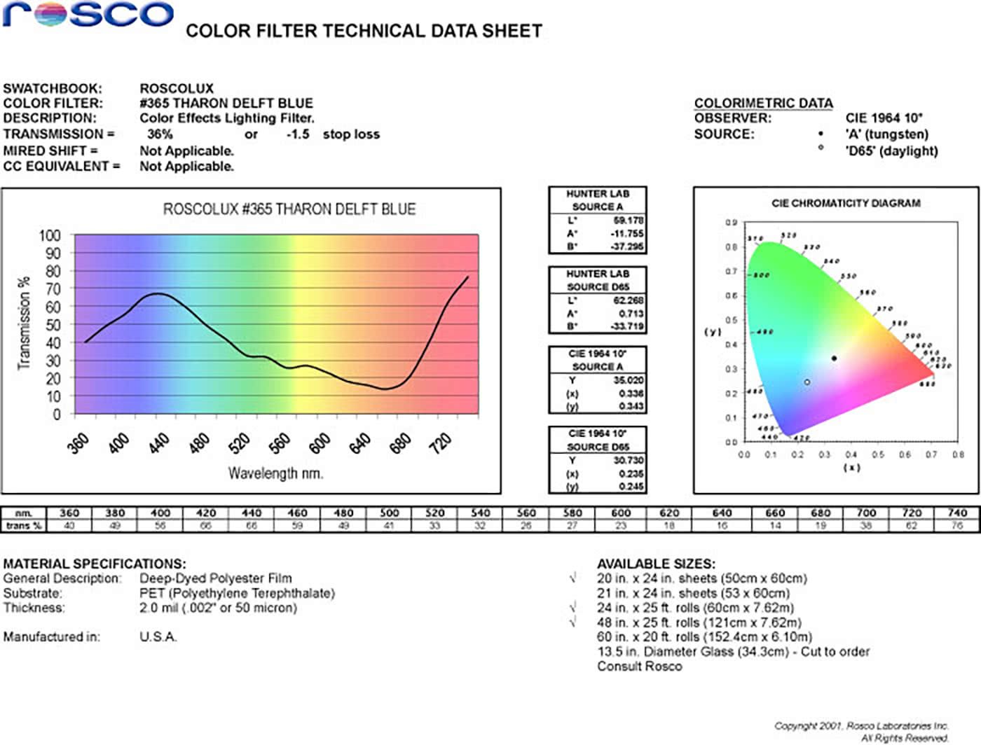 Clean blue with more red than 364. A true color correction filter for film. Converts 3200 Kelvin to 5500 Kelvin. Good for area light.